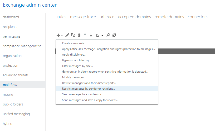 - Maak een nieuwe rule aan van type “Restrict messages by sender or recipient”