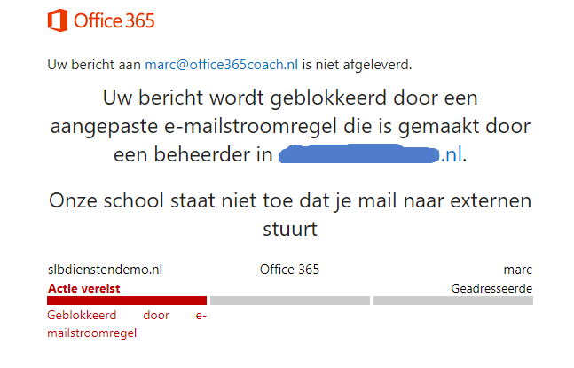 Indien een leerling nu een mail verstuurt naar iemand buiten de school, zal deze mail niet bezorgd worden en zal de leerling een foutmelding krijgen.