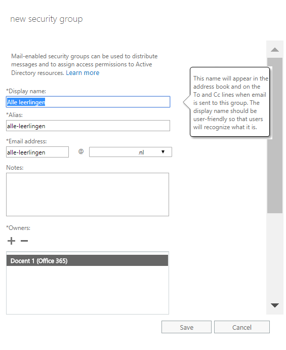 Veel scholen hebben hiervoor al een groep in een on-premises Active Directory. Deze kan via Azure AD Connect gesynchroniseerd worden naar een mail-enabled group in Azure AD.