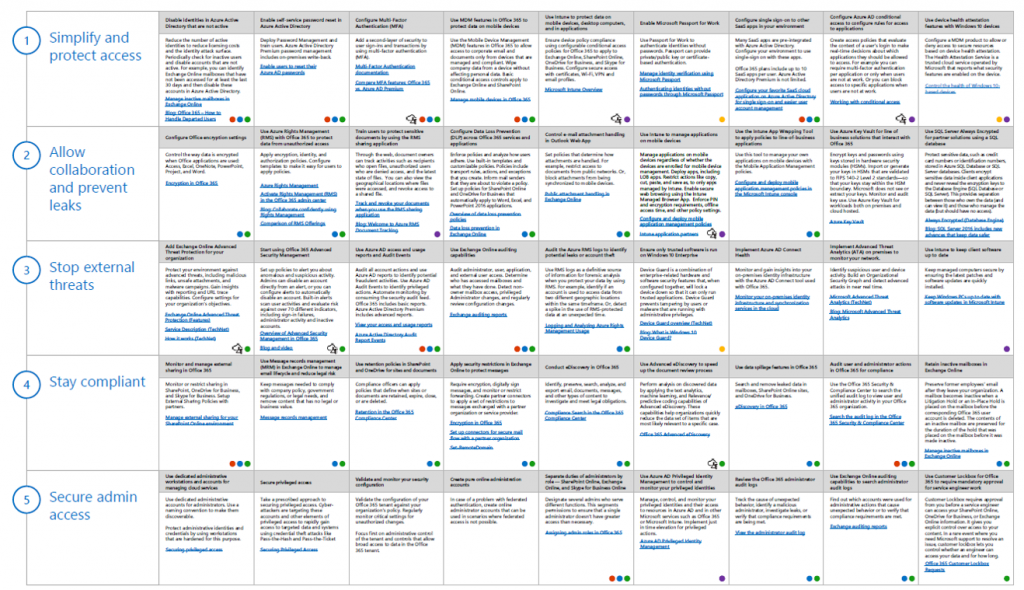 Eén van de onderwerpen die tijdens mijn trainingen vaak aan bod komt is de veiligheid van Office 365. Veiligheid wordt natuurlijk primair gecreëerd door maatregelen die Microsoft zelf neemt. Maar daarnaast is er de vraag wat je zelf kunt bijdragen om je omgeving zo veilig als nodig in te stellen. Om alle mogelijkheden die Office 365 biedt te illustreren laat ik wel eens het volgende plaatje zien om te tonen hoeveel opties er zijn om de beveiliging van Office 365 in te stellen: