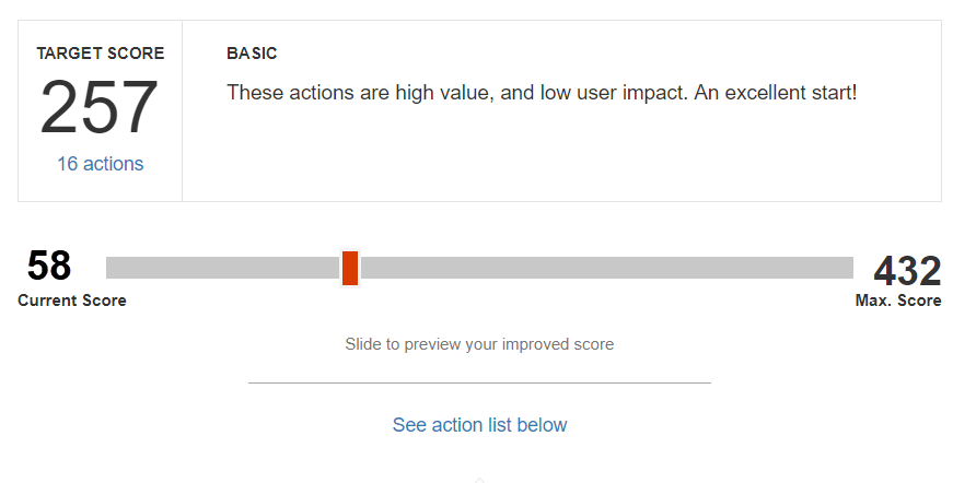 Het handige is dat je na het instellen van je targetscore direct een lijst te zien krijgt met daarin de details van de benodigde acties. Je krijgt een toelichting te zien waarom deze instelling belangrijk is én je krijgt een link naar de plek waar de configuratie uit te voeren is! Een hele handige top-down benadering dus.