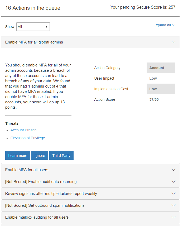 Met Third Party kun je aangeven dat je deze actie buiten de Office 365 omgeving hebt geïmplementeerd met een externe tool of door een externe partij. In tegenstelling tot de vorige optie krijg je met deze optie dan wel de volledige score voor deze actie.